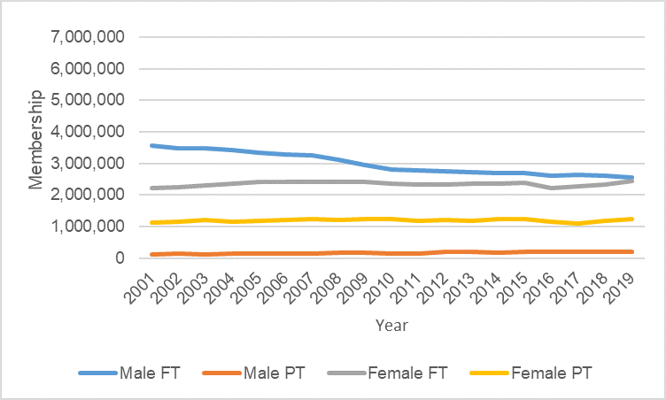 In future blogs, we will look in more detail at where this 1.01m decline FT male members occurred.