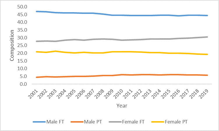 In Fig 3, we show the changes in the composition of employees by gender and employment status between 2001-2019. The male FT composition declined by 2.6 per cent from 47.0 to 44.4 per cent. Conversely, the male PT composition of the workforce increased by 1.3 per cent from 4.4 to 5.7 per cent.  During the same period, the female structure increased by 2.9 per cent to 30.6 per cent. There was a slight decline in the female PT composition of 1.7 per cent from 20.9 to 19.3 per cent.